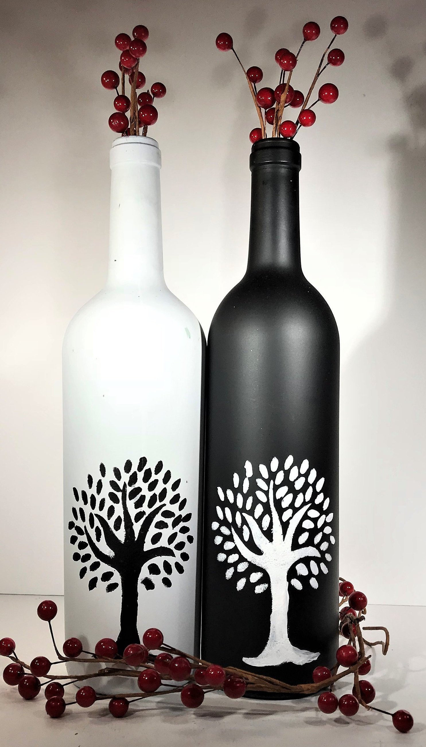 Black And White Trees Hand Painted On Wine Bottles Reflect The Etsy